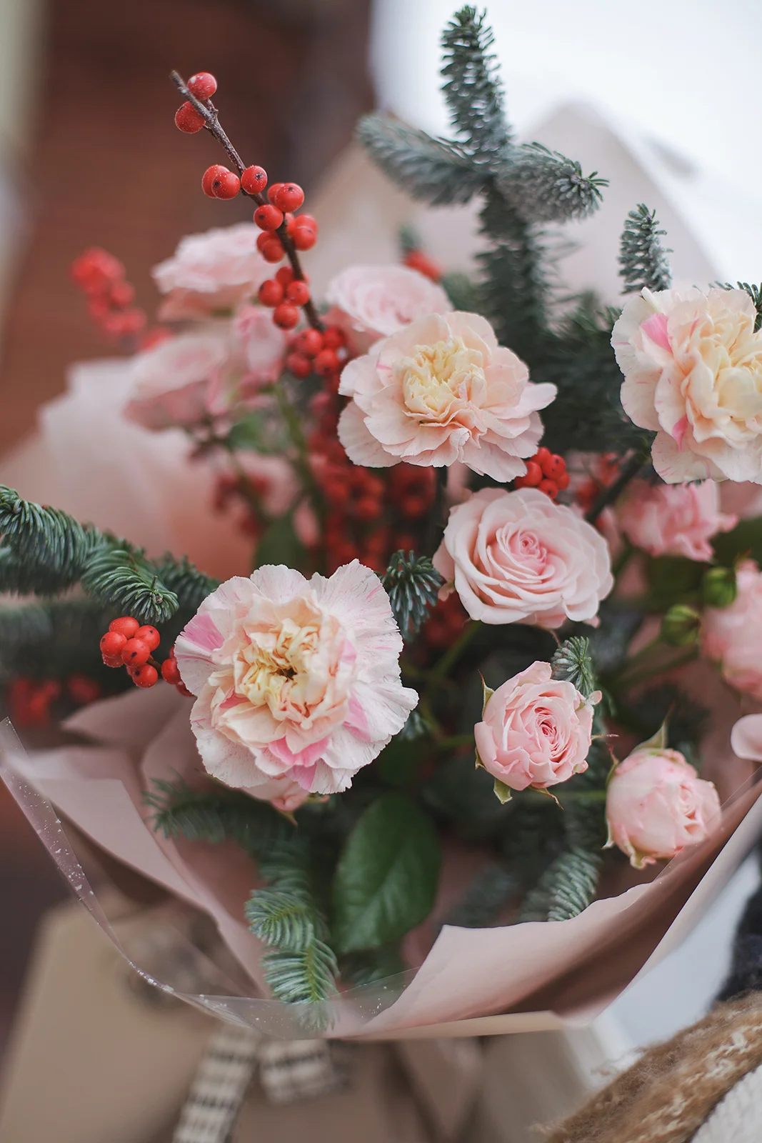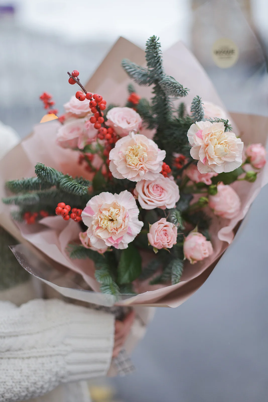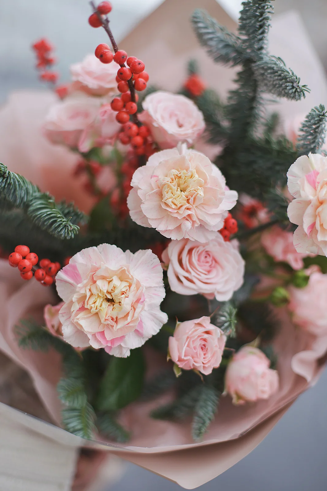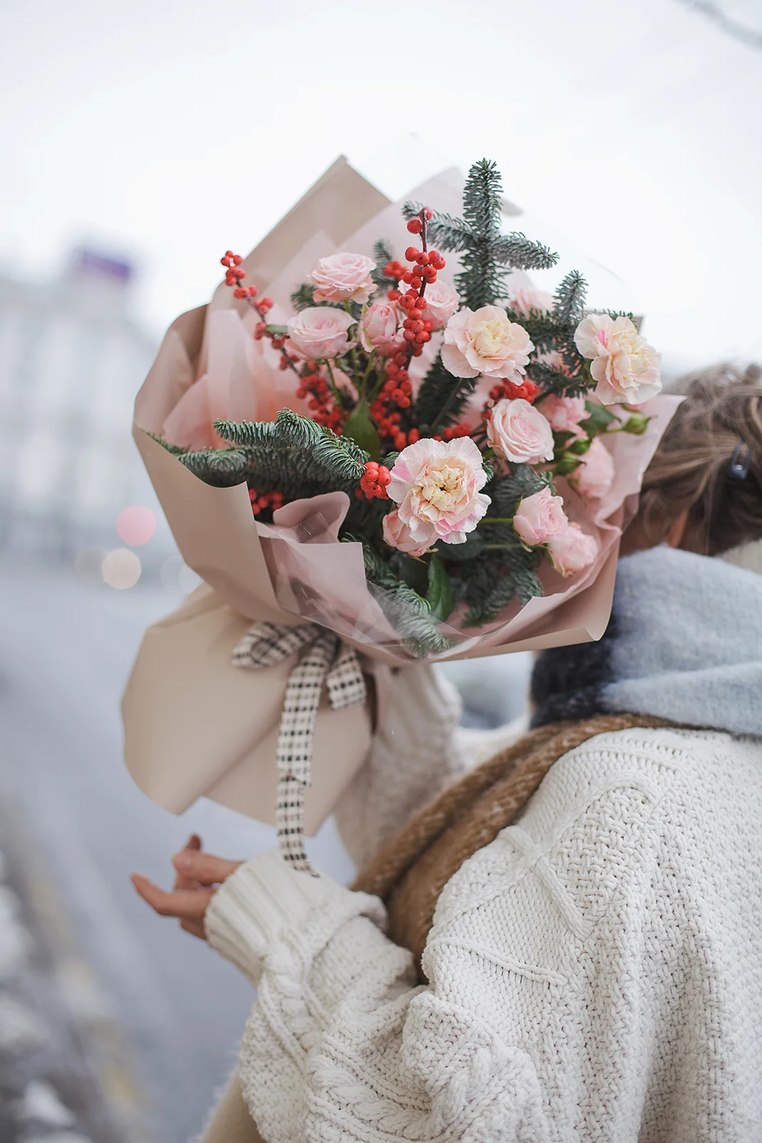 Новогодний банч — это прекрасно подобранные по стойкости, оттенку, формату свежие цветы с ветками нобилиса, которые вы можете просто поставить в вазу и наслаждаться их развитием день за днем.