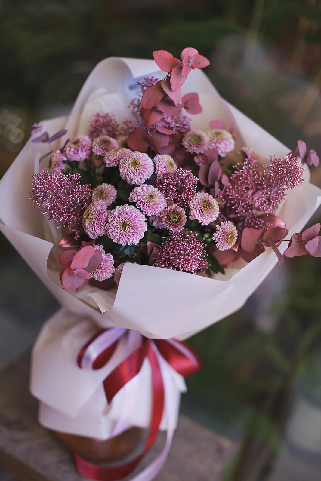 Нежные оттенки осени с зимними нотками. В одном букете мы собрали лиловые и бордовые, и брызги розового шампанского, и розовые оттенки. Волшебные ветки скимии, кустовые хризантемы и стабилизированный эвкалипт.