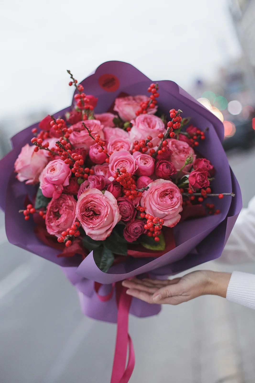 Роскошный и невероятно красивый пионовидный микс с розами и ветками иллекса, в листах воздушной пленки.