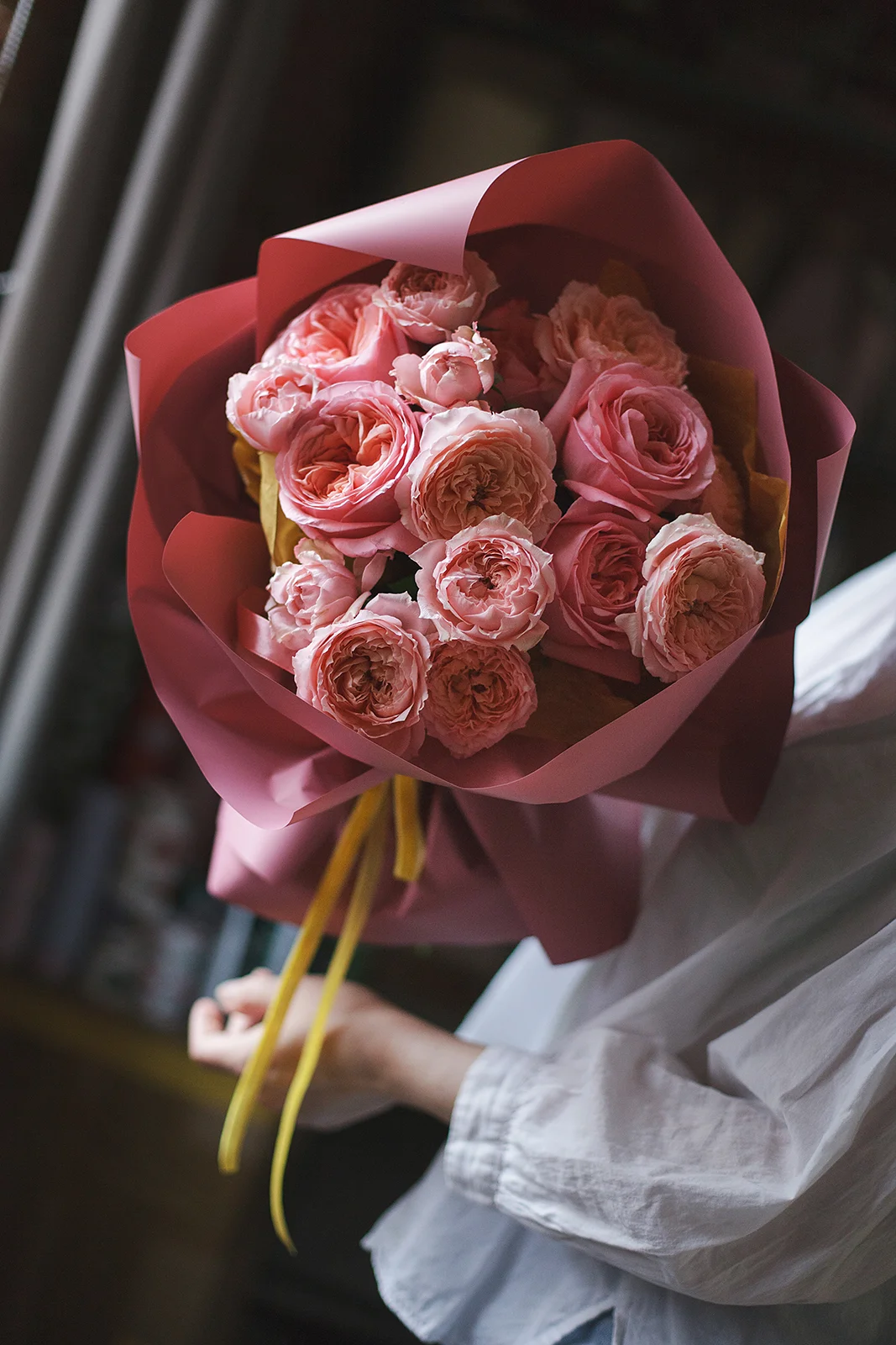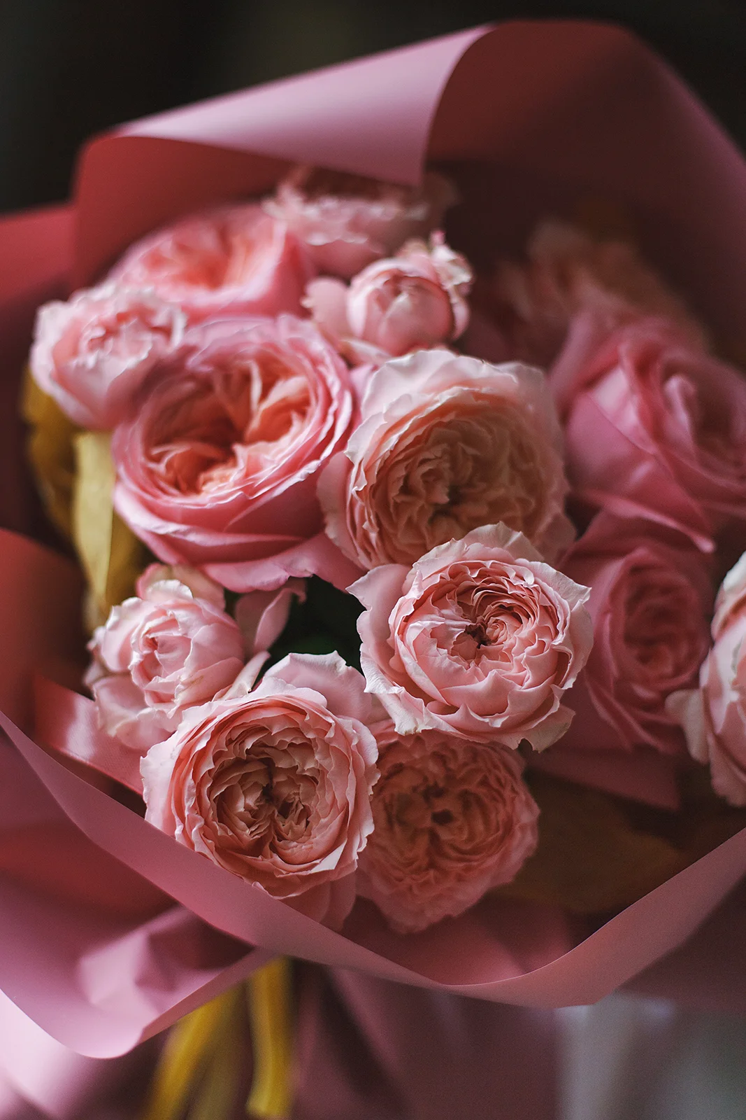 Игра контрастов и гармонии: Сочетание этих двух сортов — наша авторская находка. Воздушный светлый тон Пинк Экспрешн и насыщенная, теплая глубина розы Джульетты создают потрясающий объем и игру оттенков. Букет выглядит дорого, сложно и очень «живо».