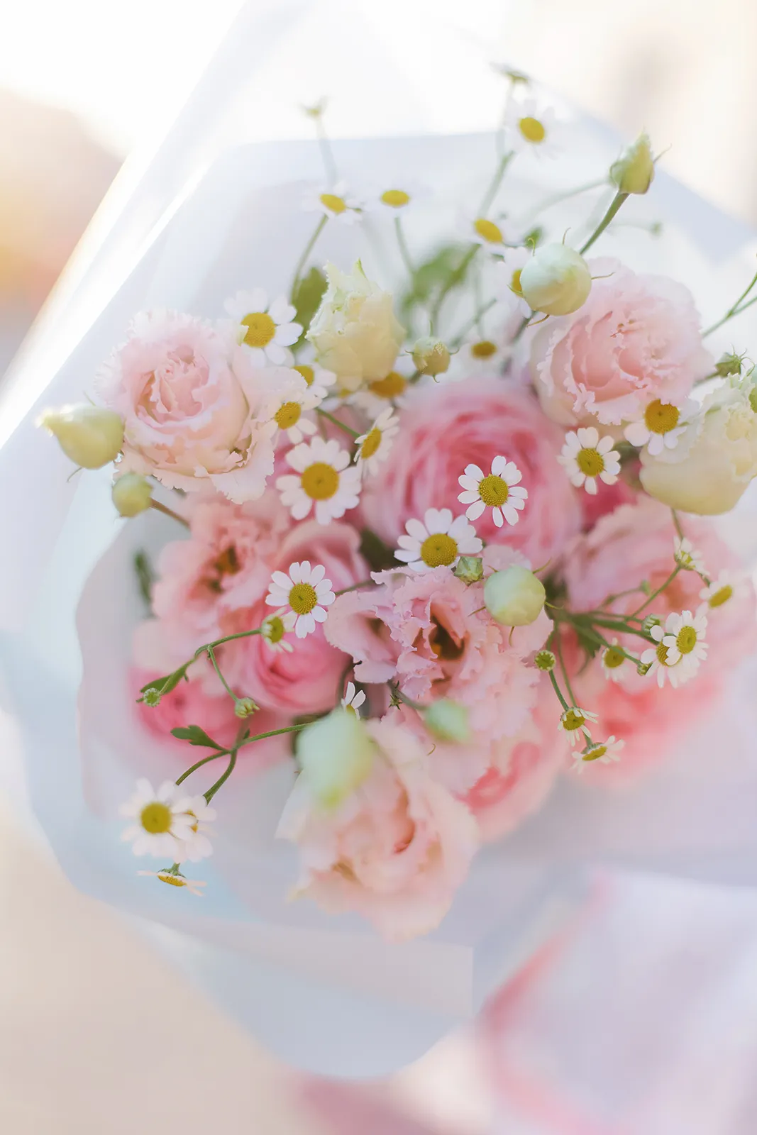 Нежные оттенки в букете. В составе пионовидные розы сорта Менсвилд Парк, волшебные резные эустомы и ромашки танацетум.