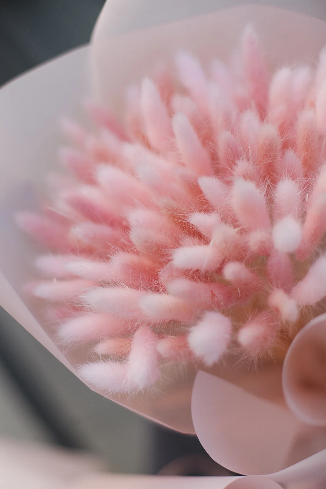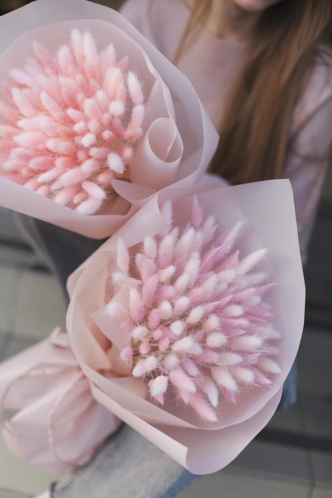 В составе: лагурус и фалярис. Букет мы упаковали в воздушные листы пленки и перевязали лентами в тон.
