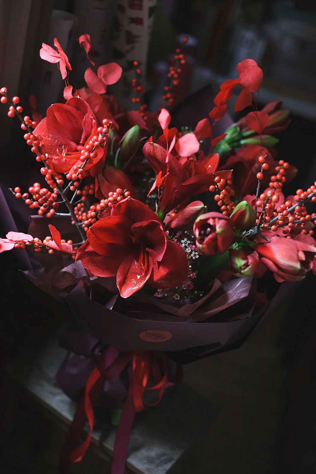 Роскошный и невероятно красивый микс с Амарилисоми Феррари, ягодами Илекса и стабилизированным эвкалиптом.