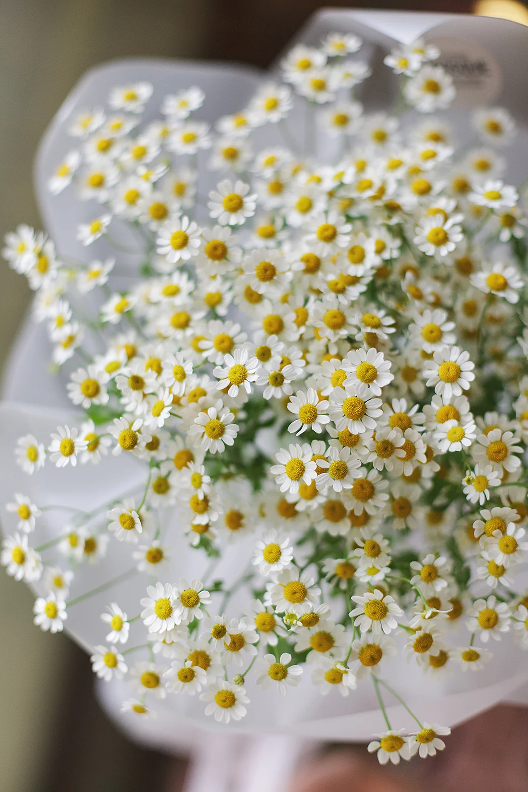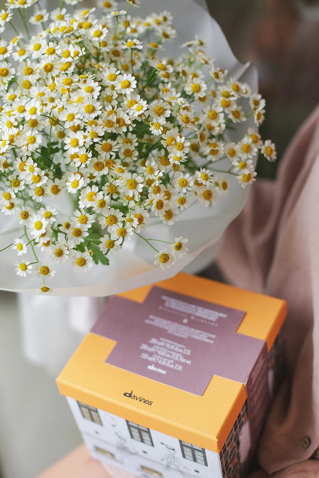 Пышная охапка ромашек в монобукете. Манящий и игривый в стильной упаковке, с красивым посланием Вашей любимой. В букете на фото 11 стеблей.