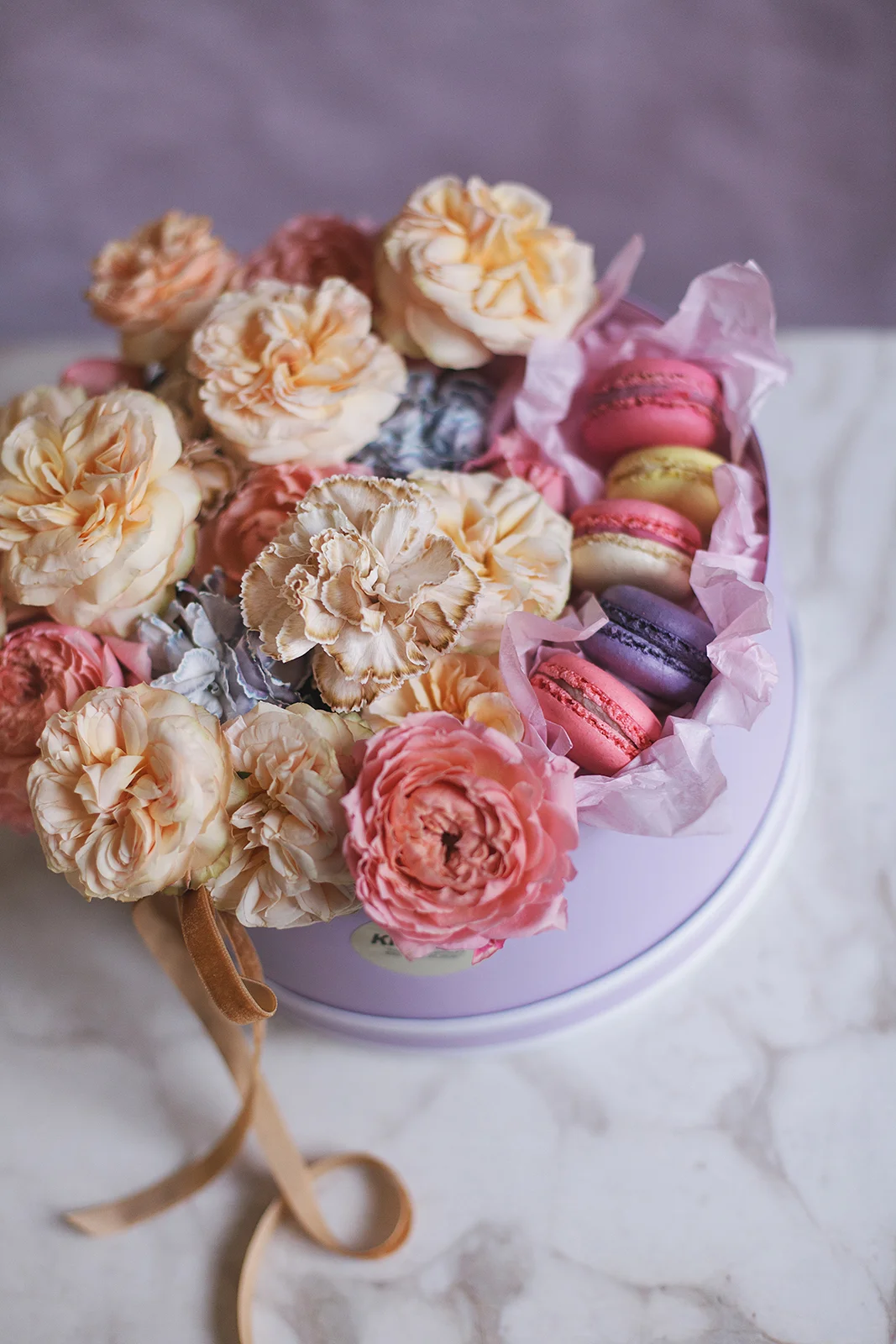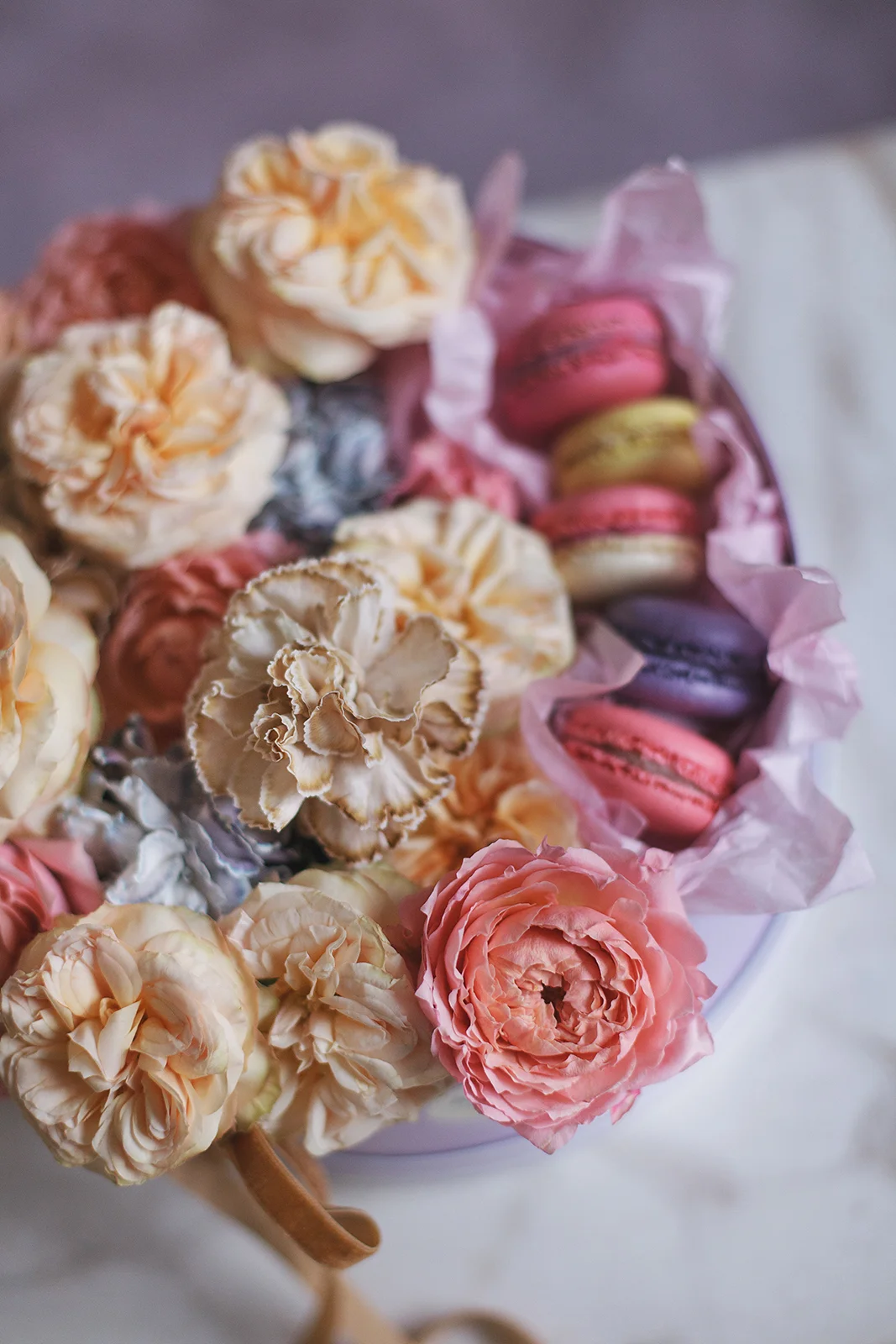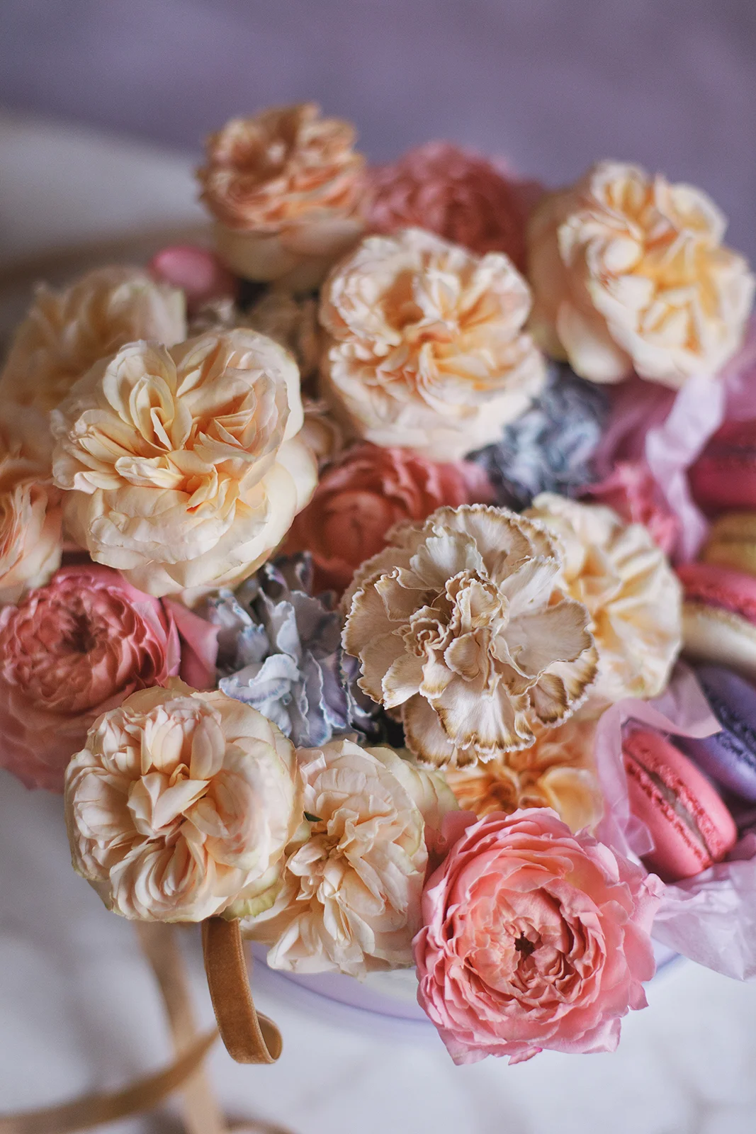 Исключительно романтичная. Композиция из садовых пионовидных роз Джульетта и Джентл Трендсеттер, гвоздик и Macarons. К композиции в шляпной коробке мы добавили бархатные ленты в тон композиции.
