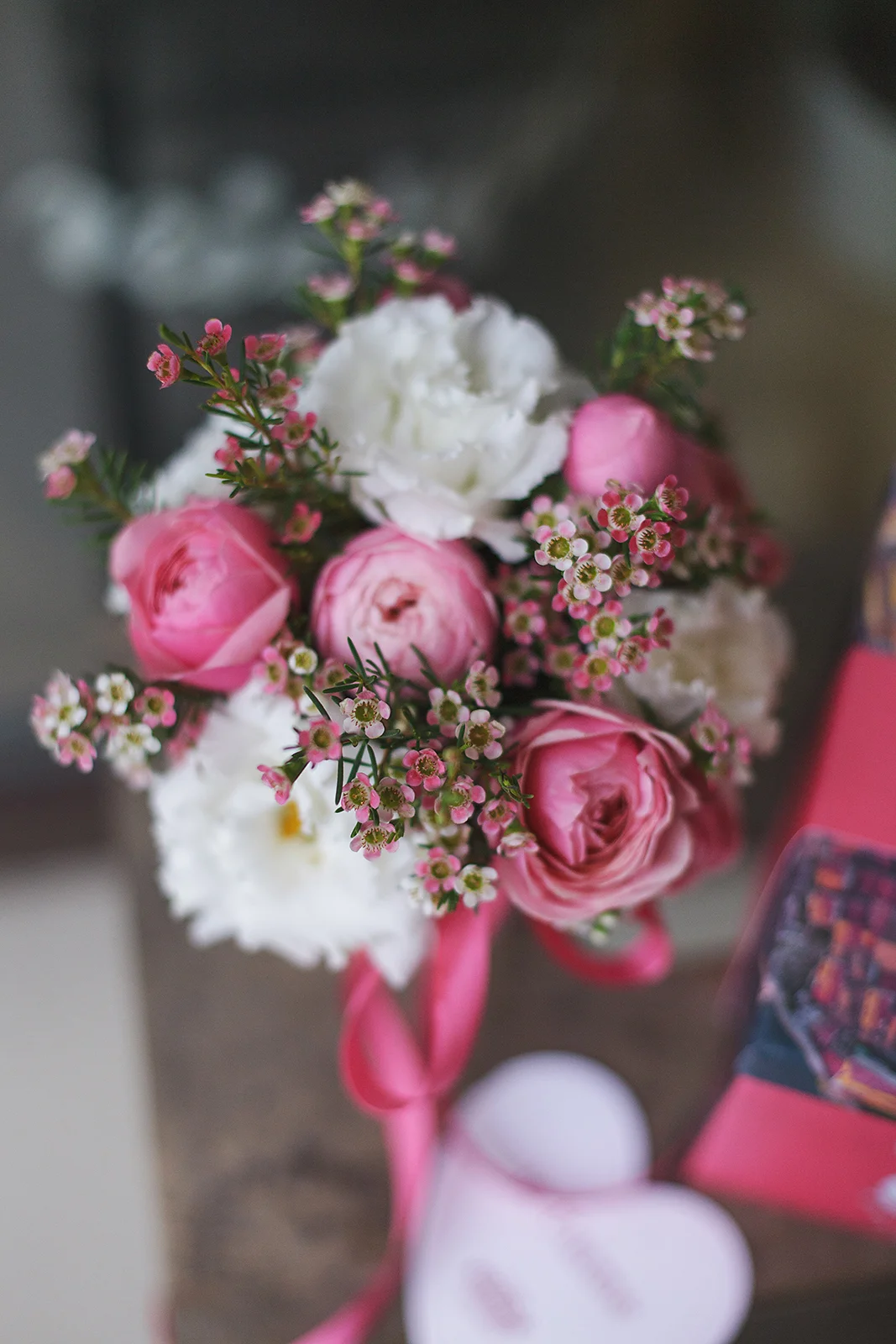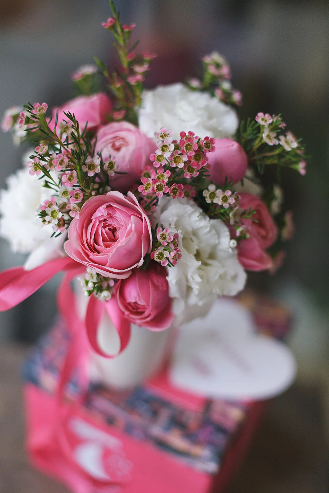 Цветочный кофе в нежной бело-розовой гамме. В состав мы включили пионовидные розы сорта Сильвия Пинк, хамелациума и резной эустомой и добавили ленты в тон.