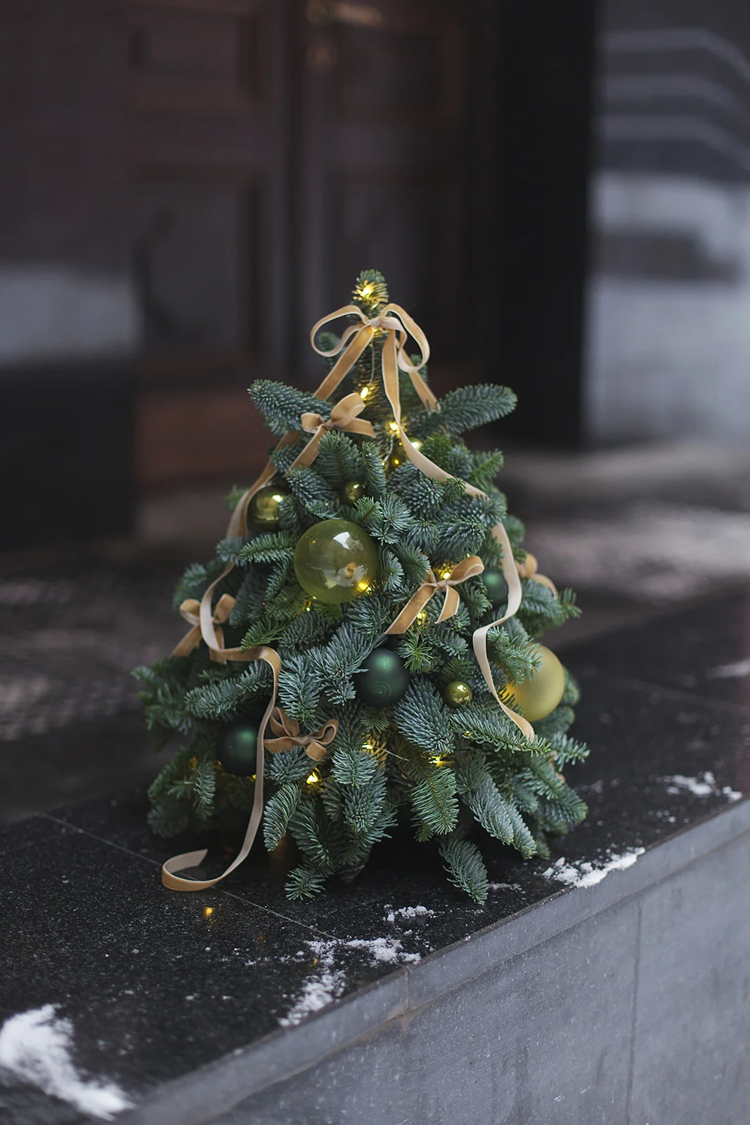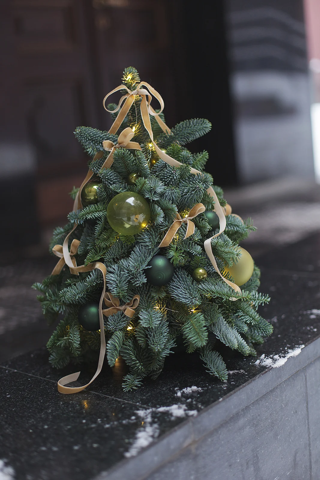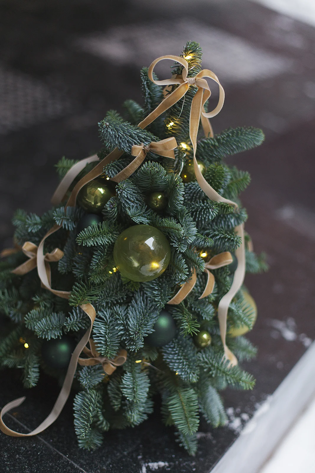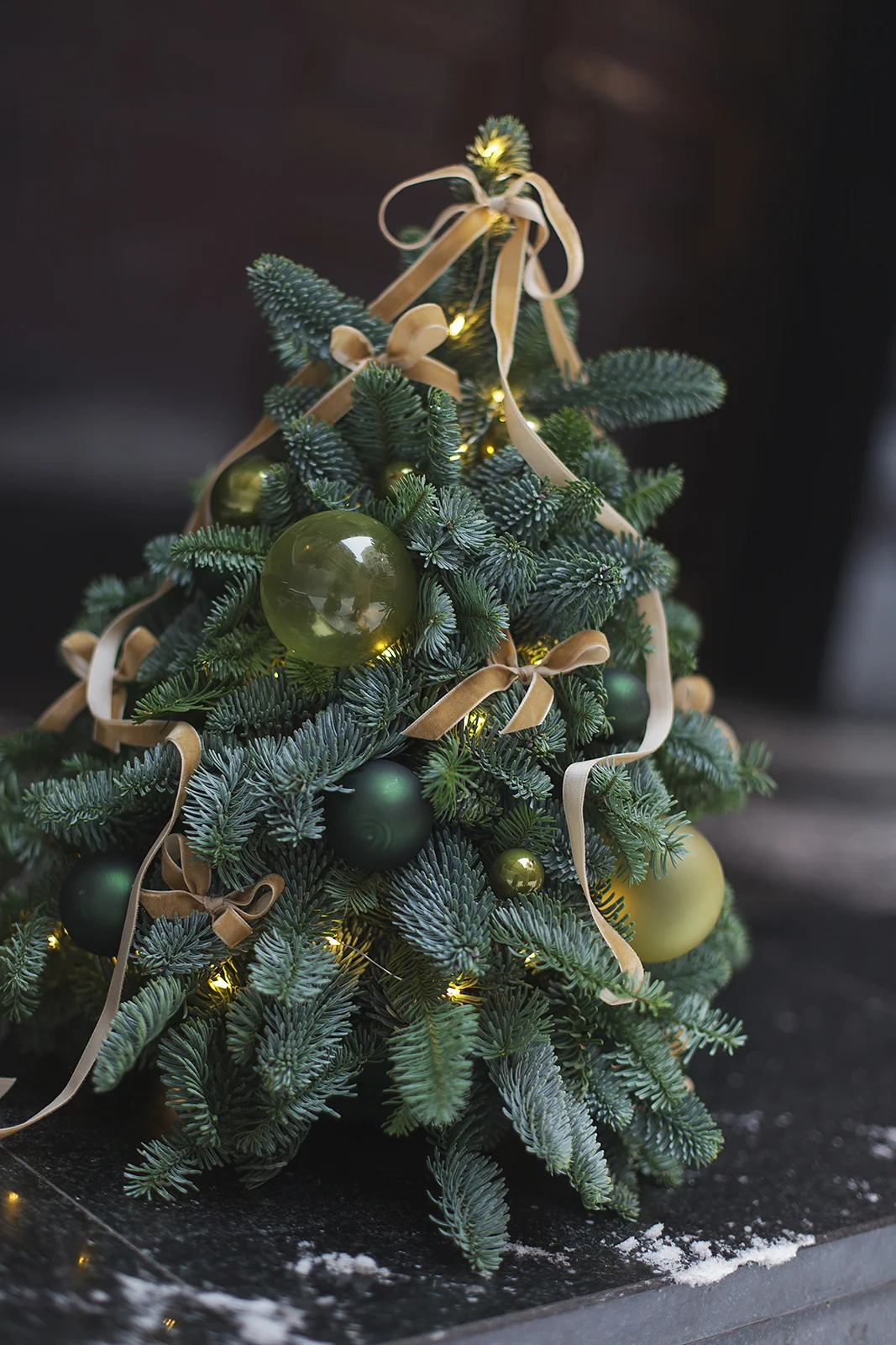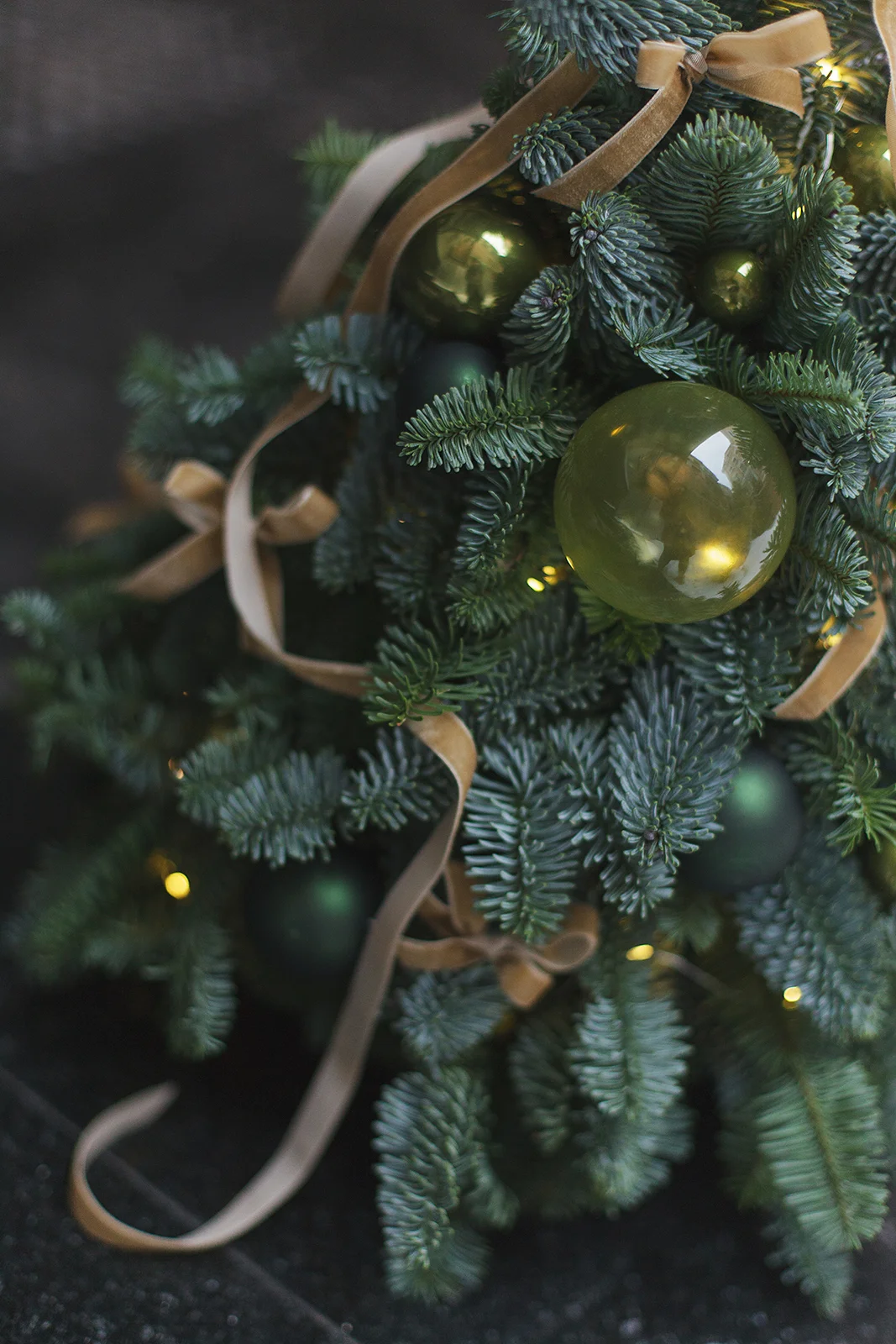 Новогодняя елочка из Нобилиса украшена стеклянными шарами и бархатными лентами в тон.