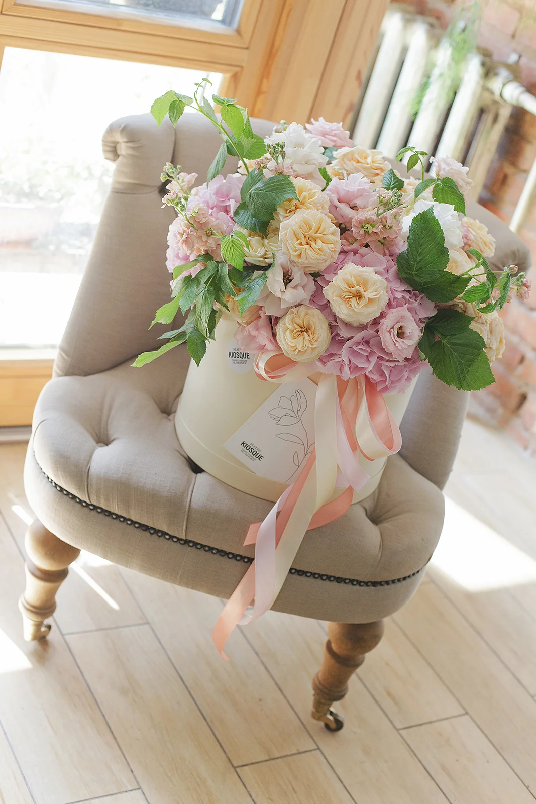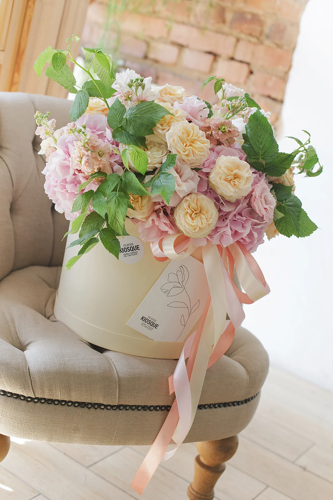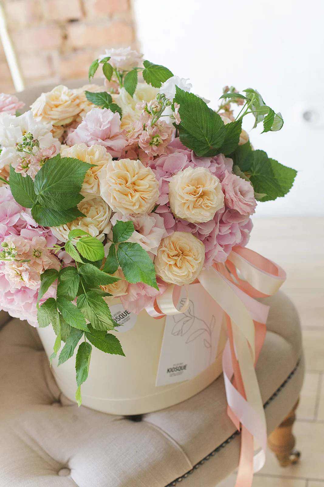Когда хочется много и пышно, нежно и с любовью. Большая композиция в шляпной коробке, наполненная исключительно прекрасными цветами. В составе отборный микс пионовидных кустовых роз, маттиола, россыпь эустом, гортензии, ветки малины.