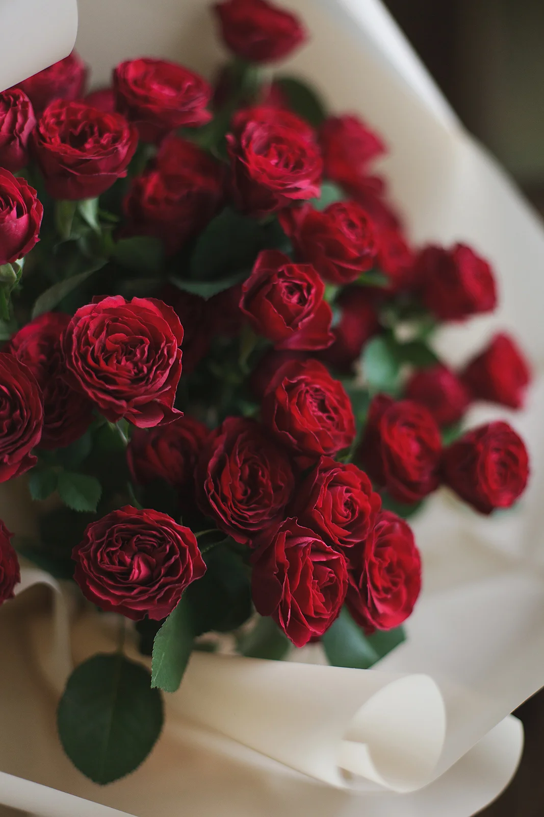 Монобукет из пионовидной розы сорта Ред Трендсеттер в благородном бордово-красном оттенке. 7 веток пионовидной розы, собранных в букет, выглядят пышно, а листы серой пленки добавляют стиля и лаконично завершают композицию.