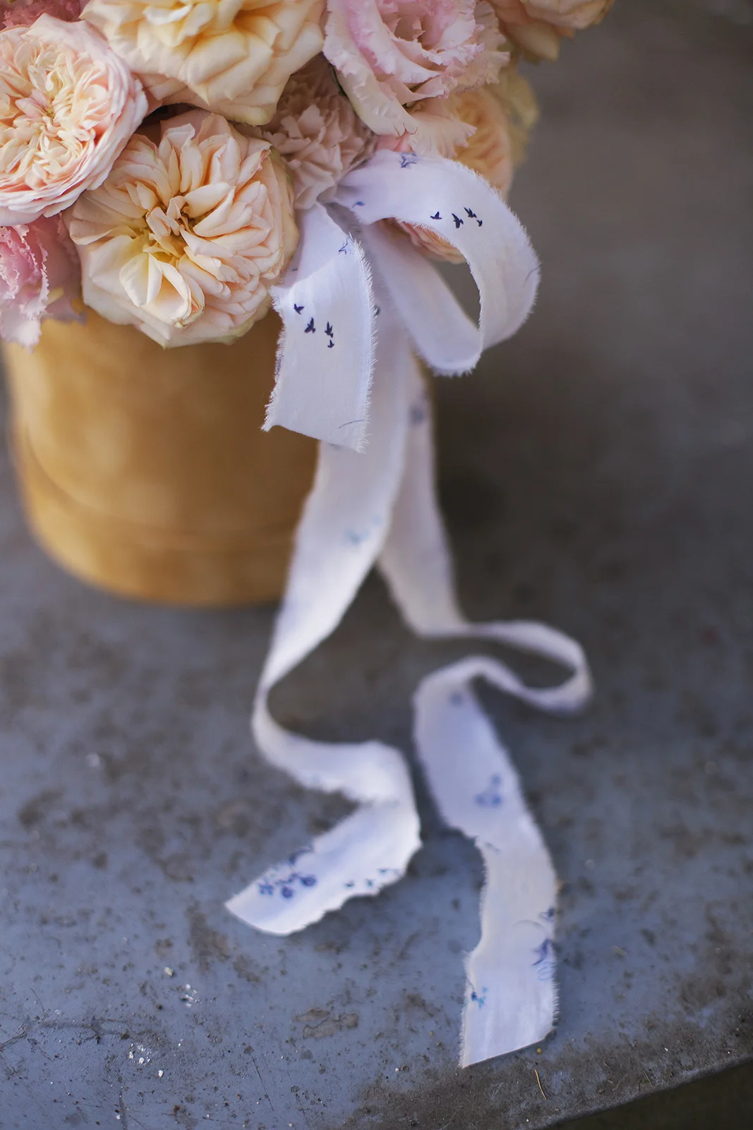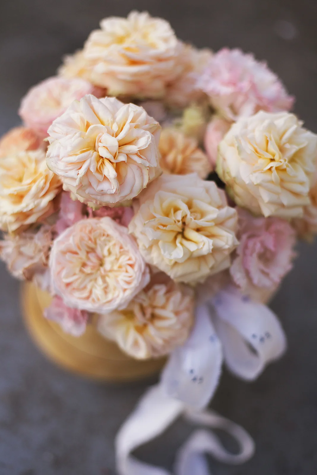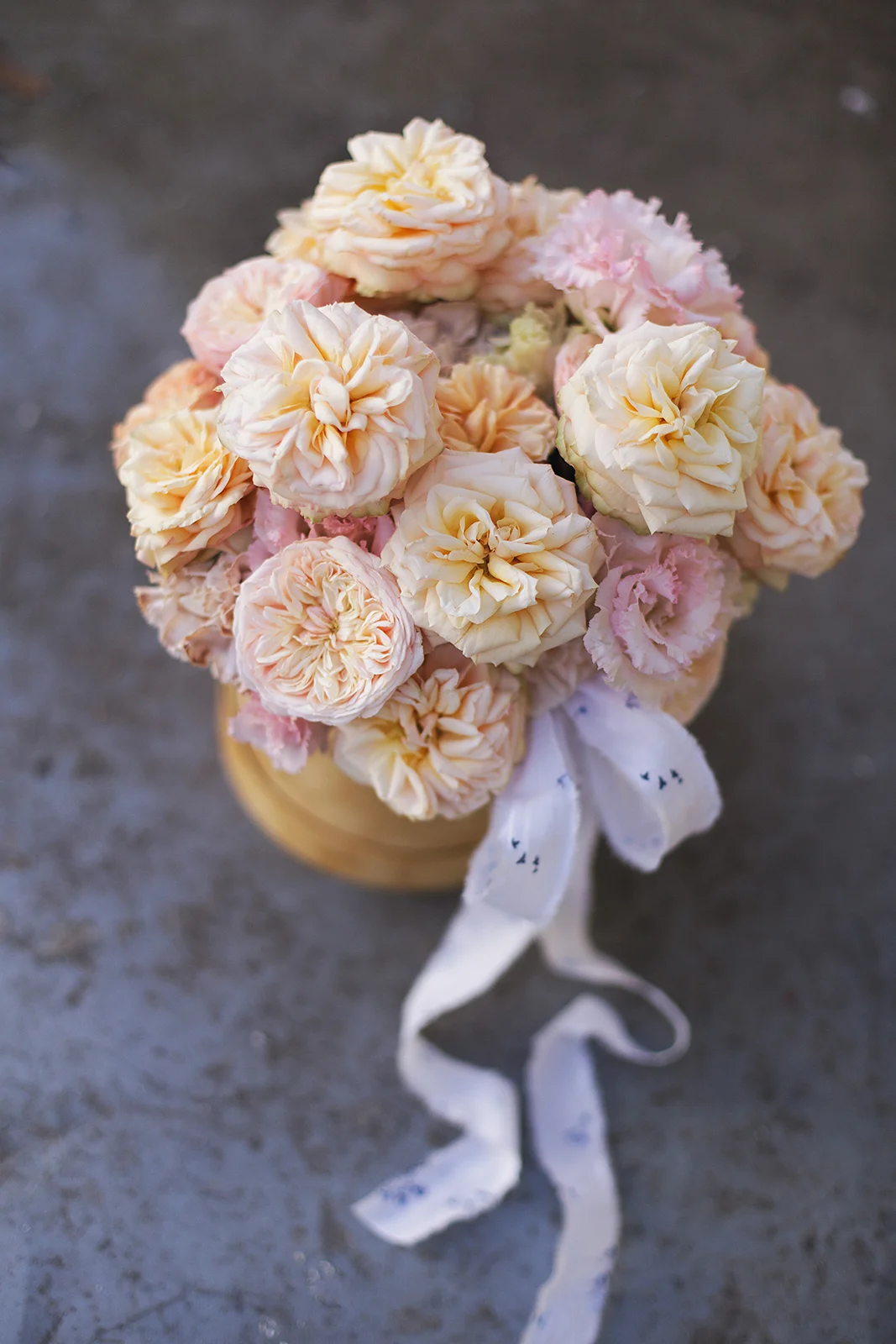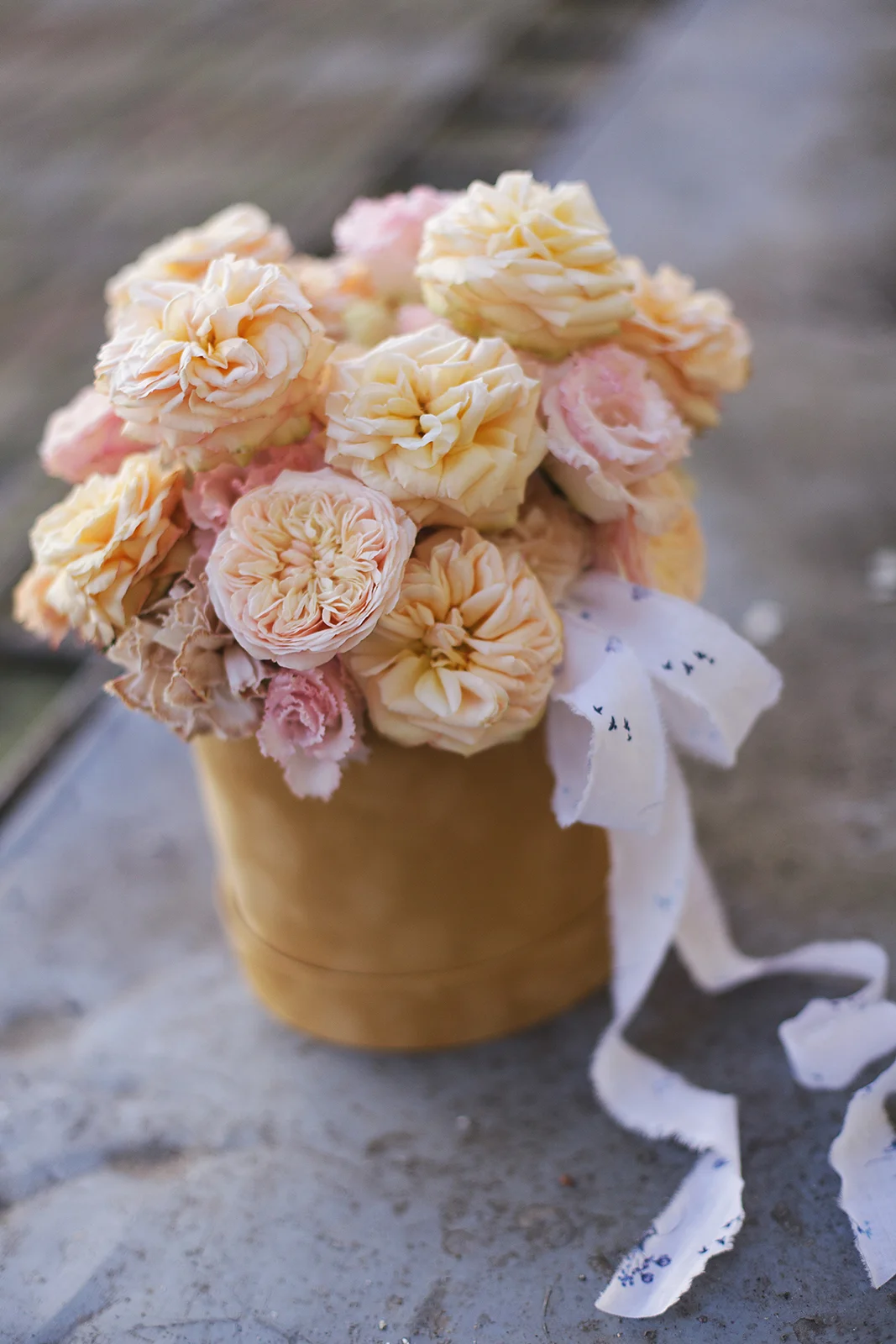 Цветочная нежная композиция из персиковых садовых роз Джентл Трендсеттер и Роял Блаш, с махровой розовой эустомой, ароматной гвоздикой в шляпной коробке.