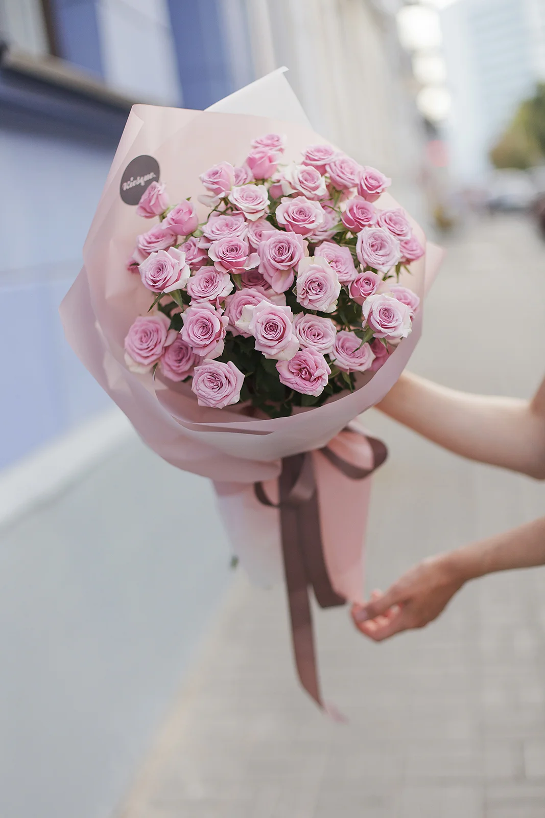 Монобукет из садовой розы сорта Лейла в нежном лавандовом оттенке. 7 веток кустовой розы, собранных в букет, выглядят пышно, а листы матовой нежно-розовой пленки добавляют романтичное настроение.