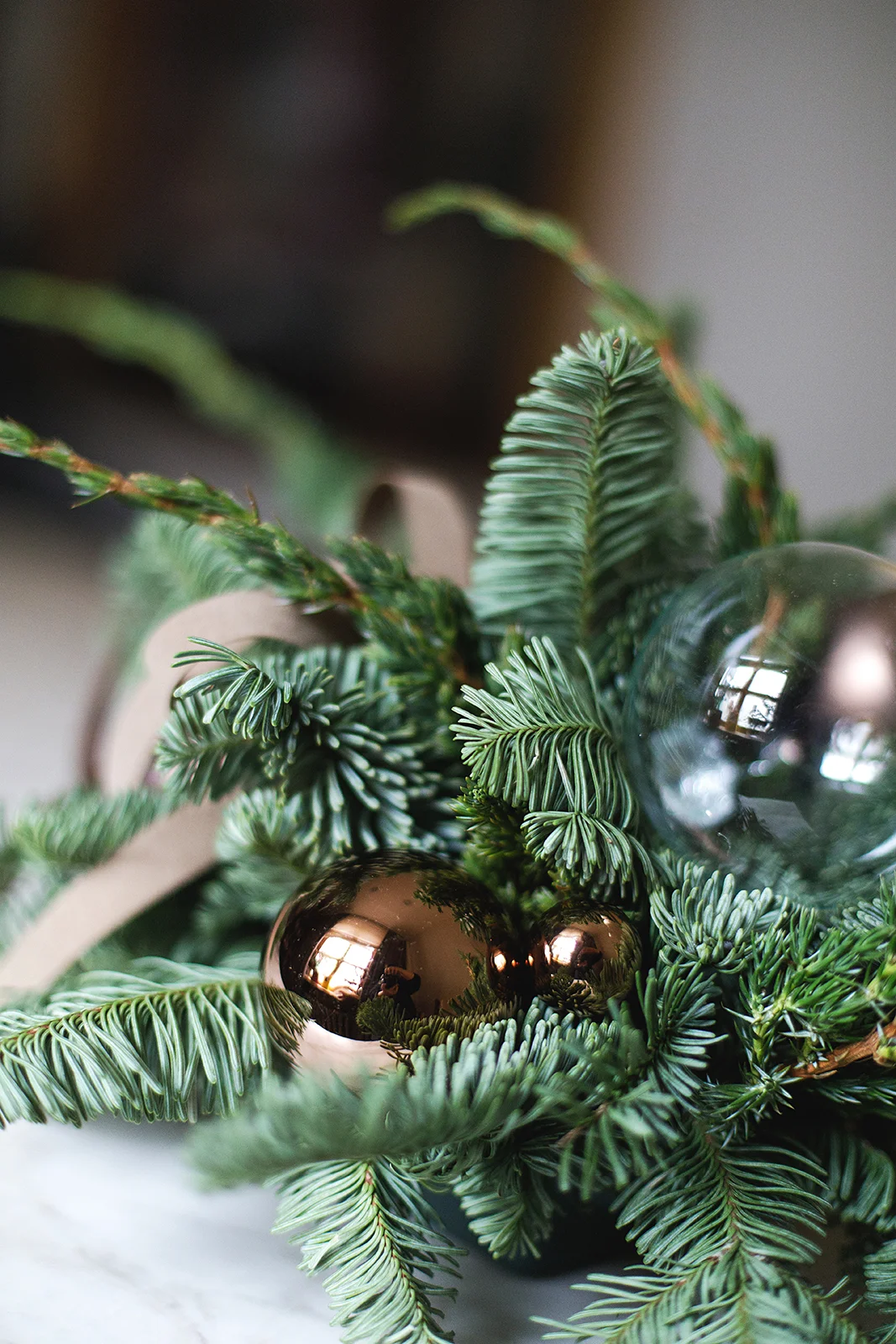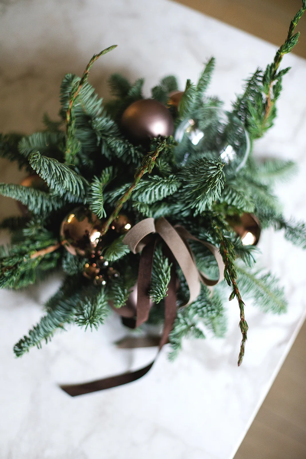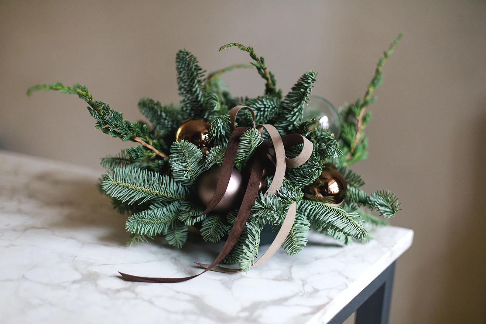 Новогодняя композиция их хвои и стеклянных шаров