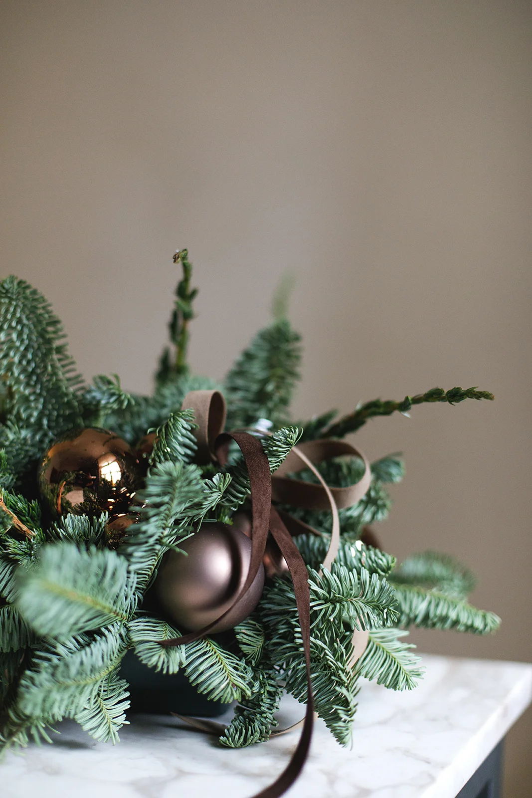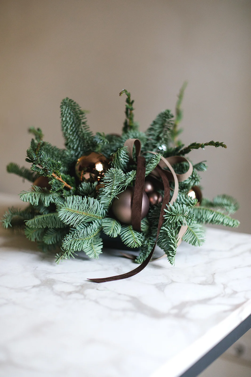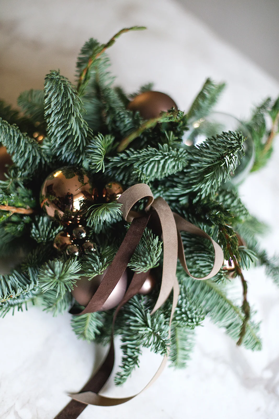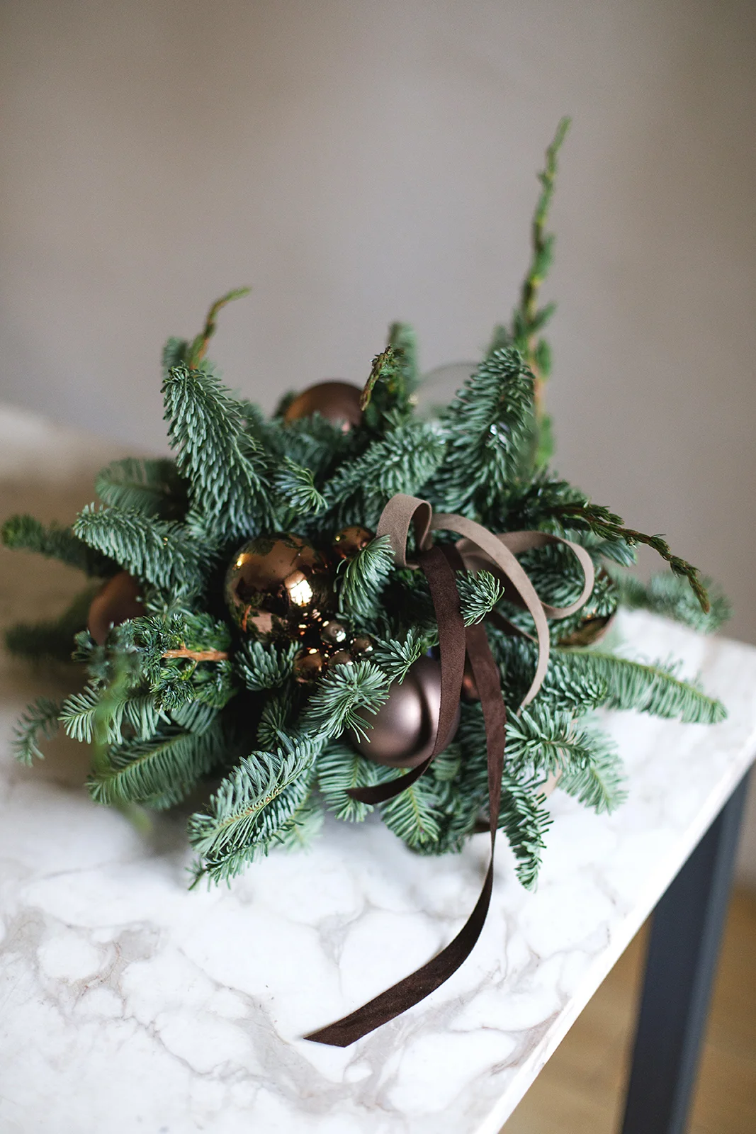 Новогодняя композиция их хвои и стеклянных шаров