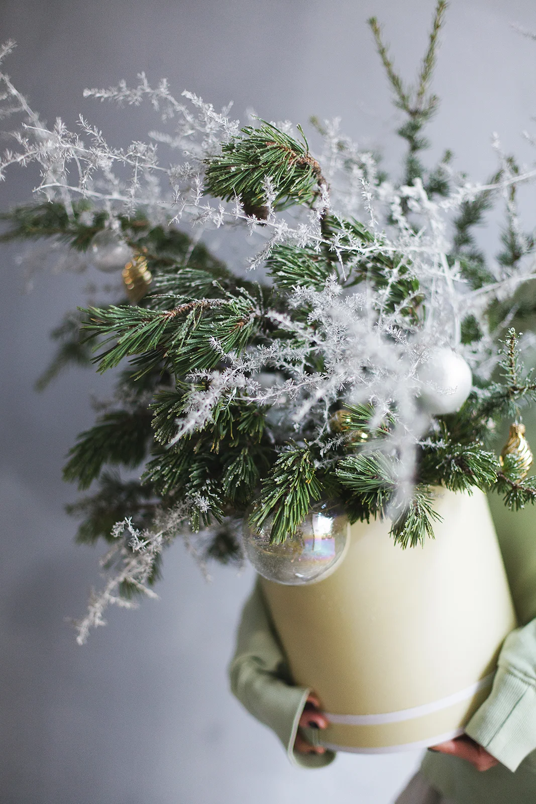 Ароматная композиция из микса хвои и заснеженного аспарагуса в шляпной коробке, украшена стеклянными шарами.