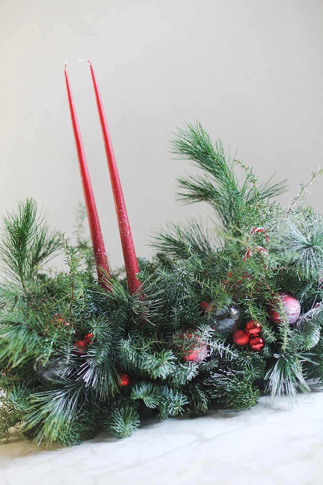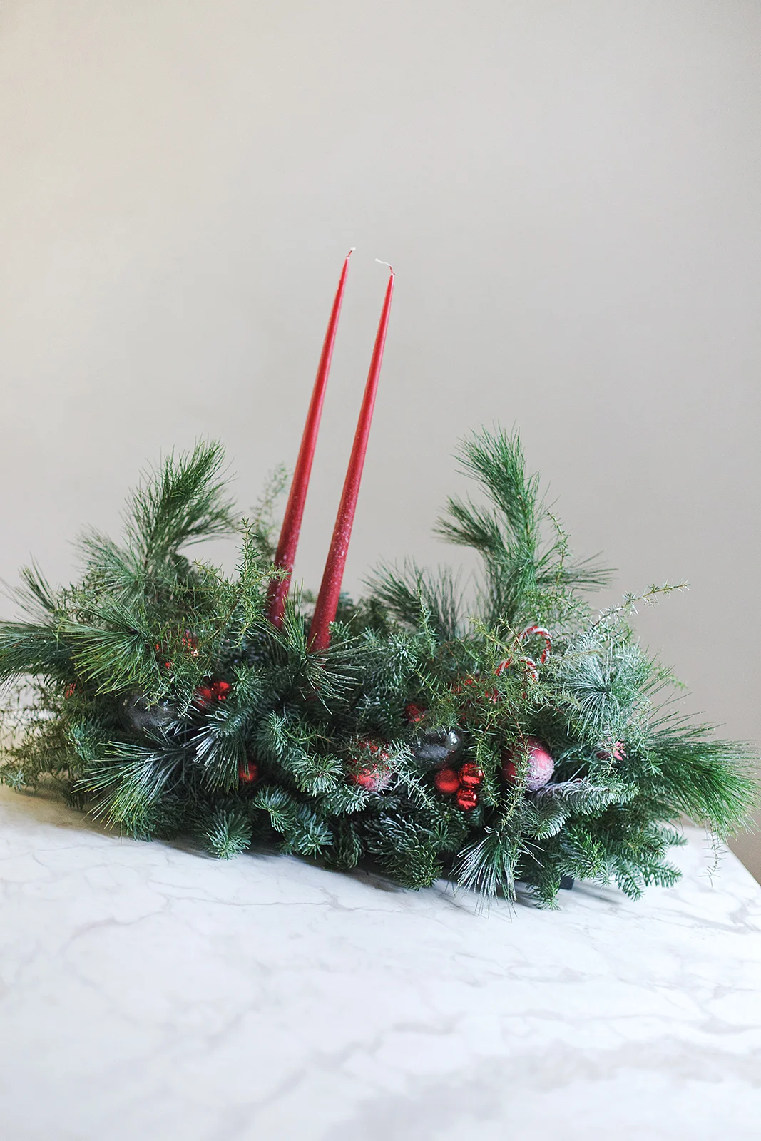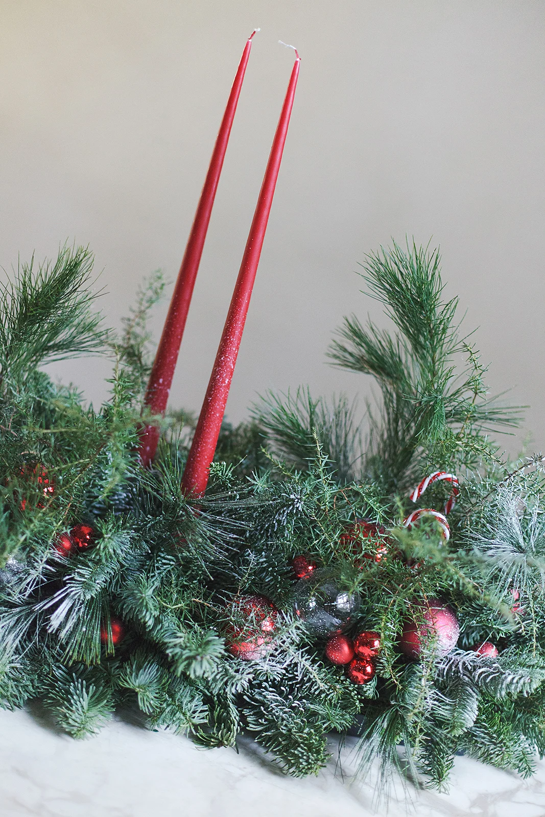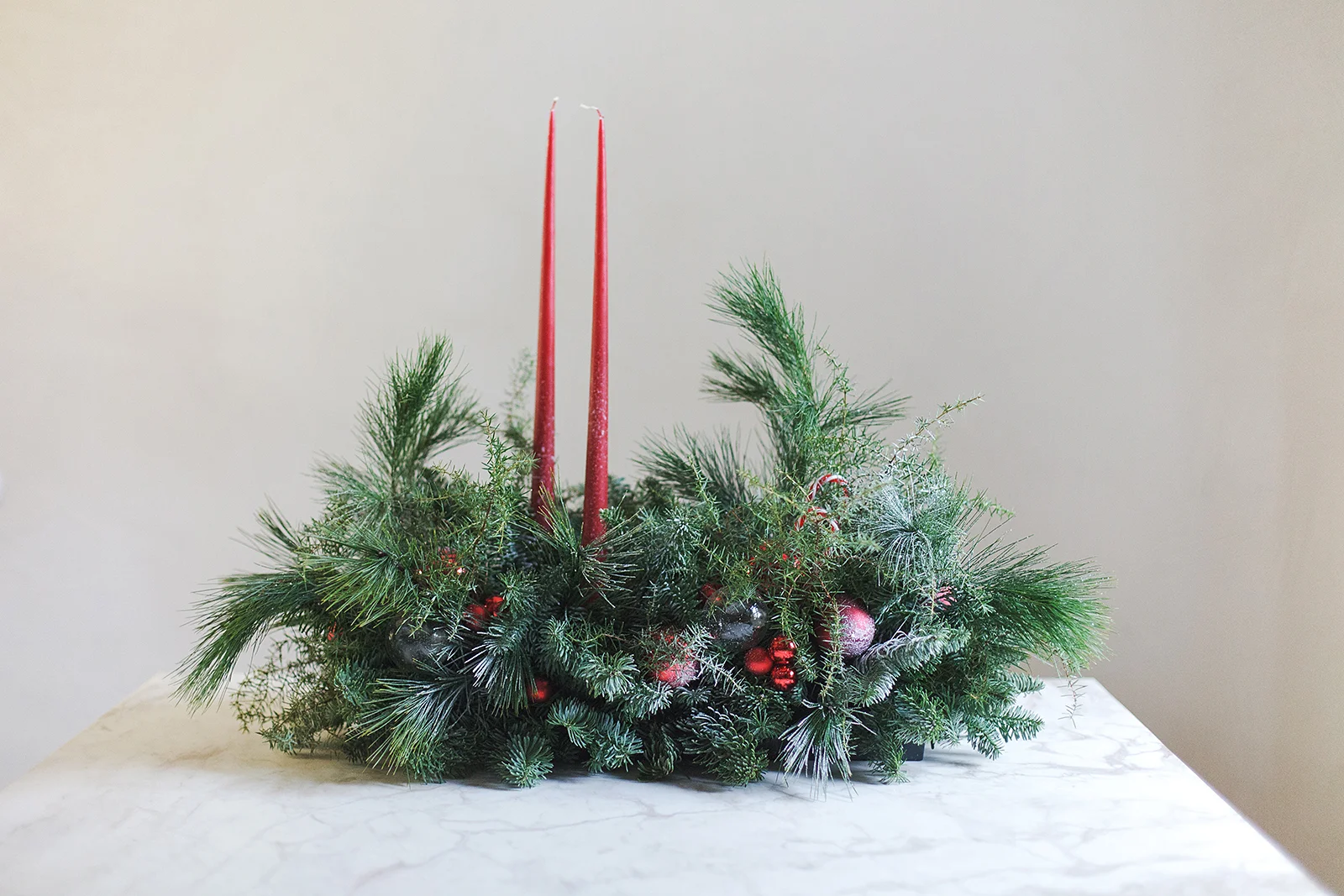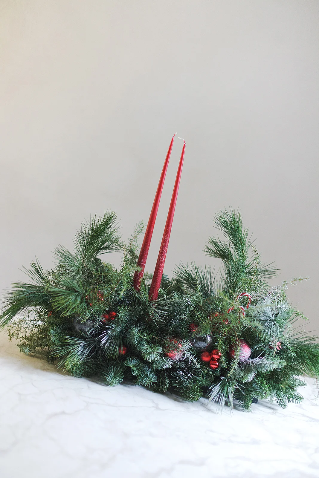 Композиция из микса хвои, украшена стеклянными разноцветными шарами и свечами. Не требует ухода и будет радовать Вас долгое время. Изготовить новогоднюю композицию мы можем в любой цветовой гамме. Все Ваши пожелания по декору вы можете обсудить с нашими флористами при оформлении заказа.