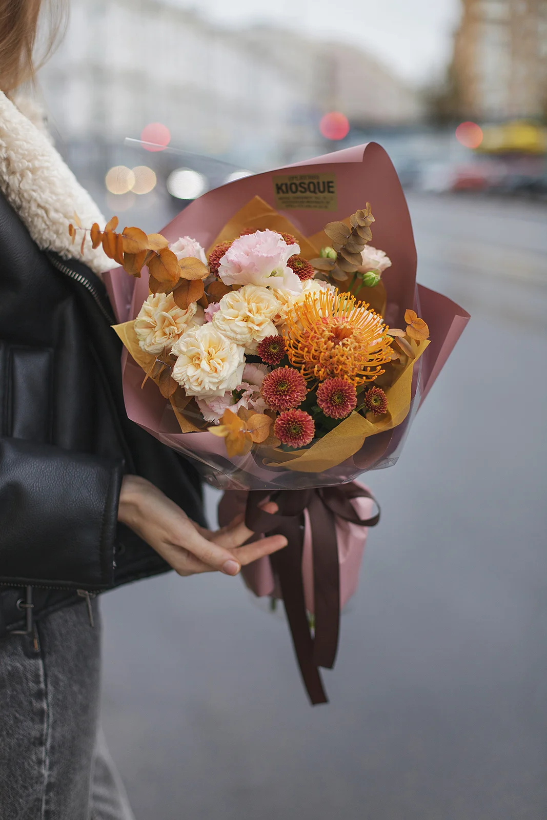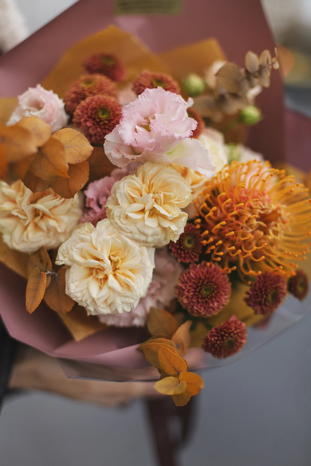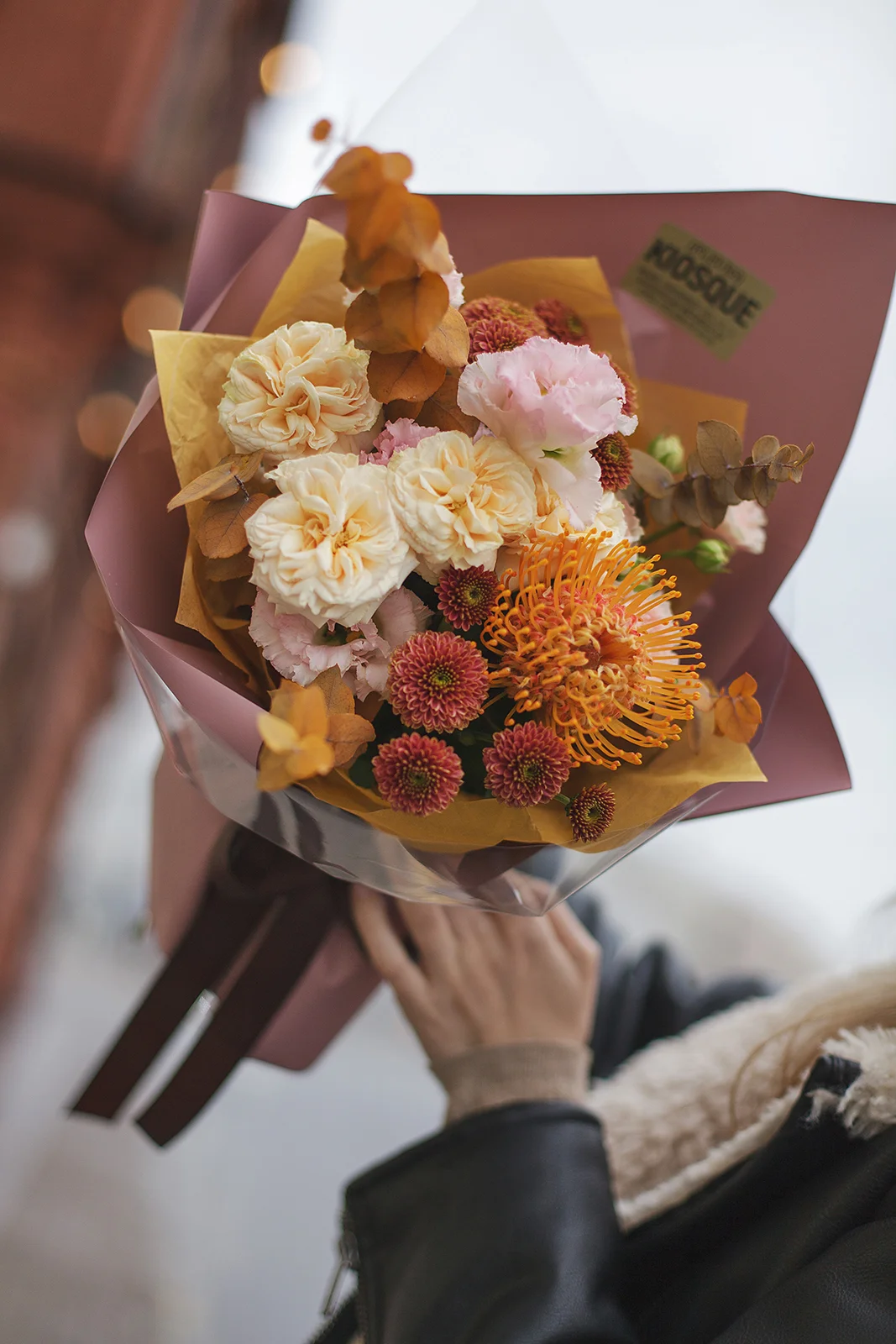 Теплый осенний букет с нотками экзотического леукоспермума, резной эустомы, хризантем сантини, сливочных пионовидных роз Джентл Трендсеттер и красочного эвкалипта. Букет мы упаковали в листы воздушной пленки и тишью, чтобы подыграть осенним оттенкам и перевязали лентами в тон ягод.