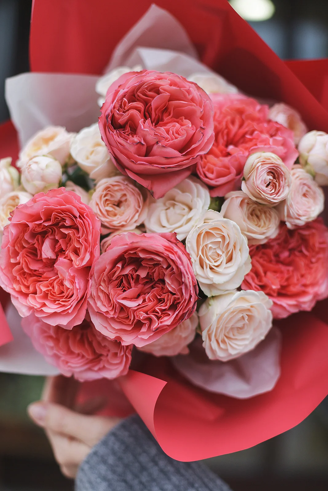 Роскошный микс из пионовидных роз разных сортов. В состав мы включили кустовую пионовидную розу Бритни, Свит Софи и плотные шарики Пинк Экспрешн. Упаковали воздушными листами пленки и перевязали лентами.