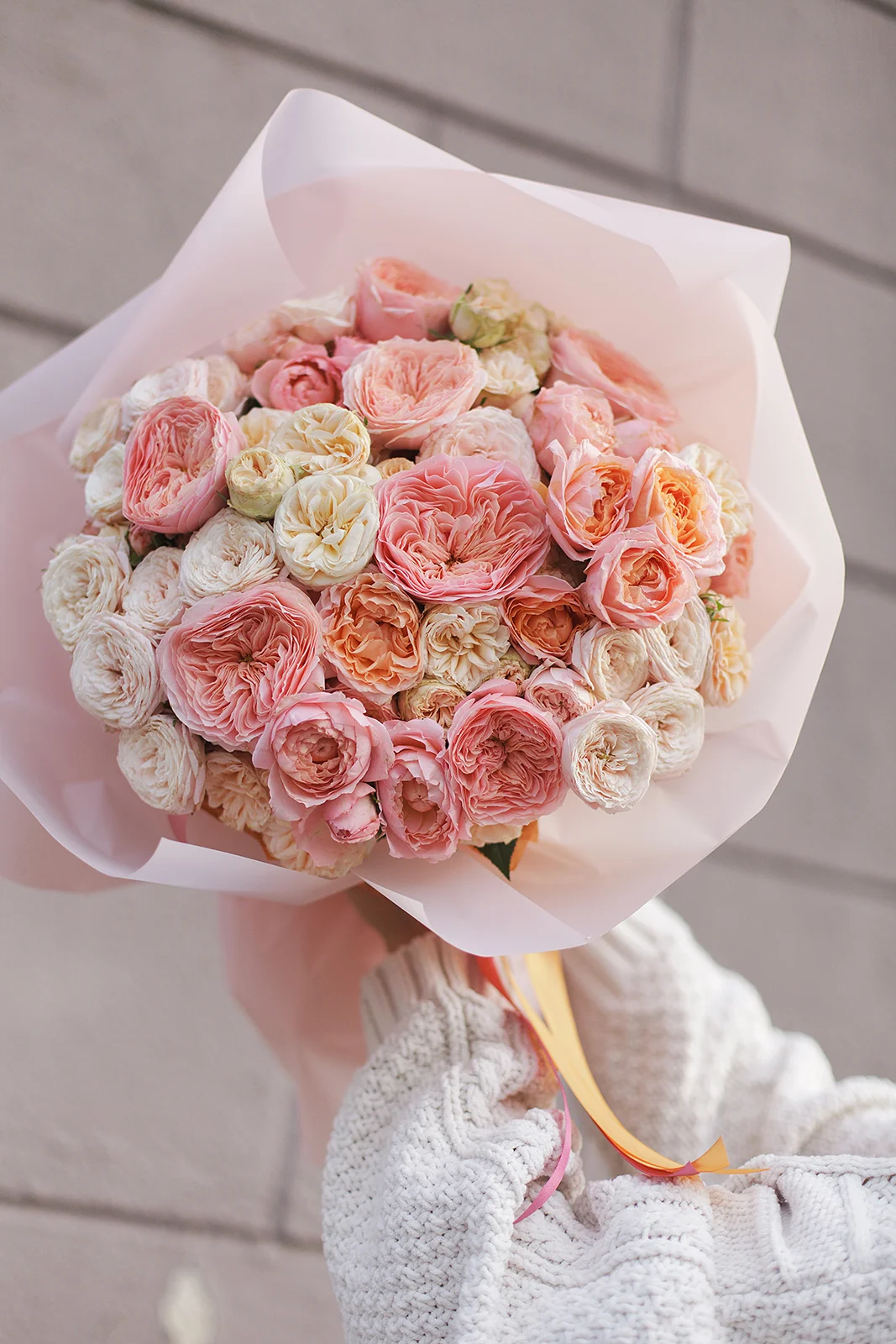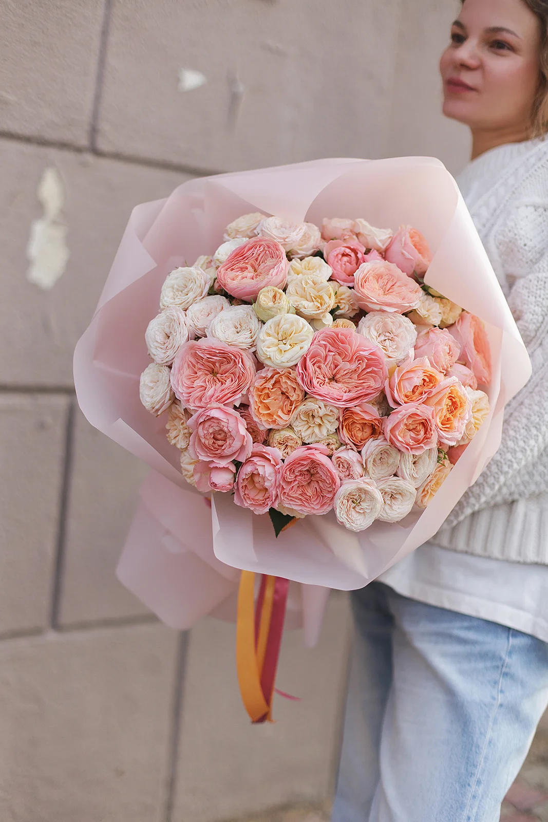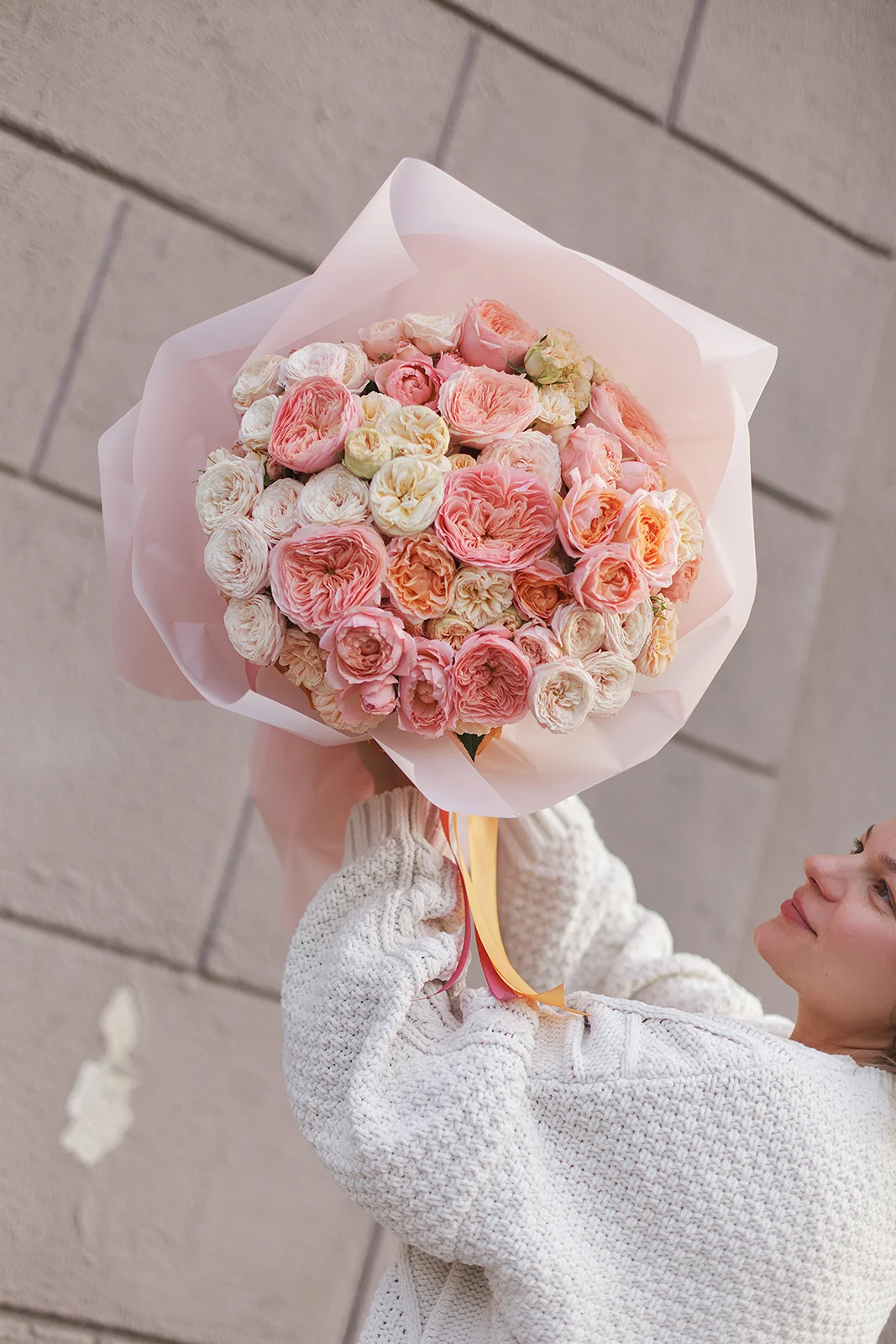 Этот букет — наше самое вдумчивое предложение для тех, кто ценит не только красоту, но и характер. Мы собрали вместе самые изысканные сорта пионовидных роз, чтобы создать эффект пышного, только что расцветшего куста. Каждый слой — это новый оттенок, новая фактура, новая нота в гармонии.